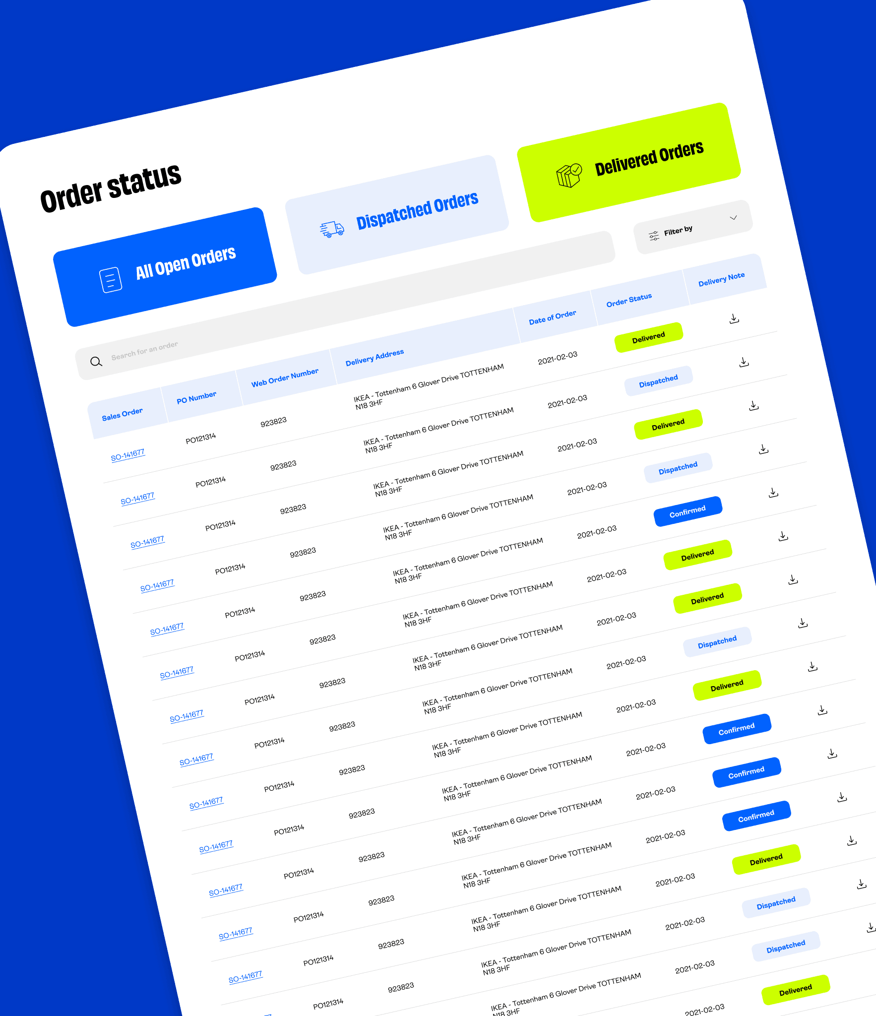 A simplified order management interface with clearer status grouping, unified search and faster access to individual order downloads. Designed to improve scanability and reduce friction in high-volume workflows.