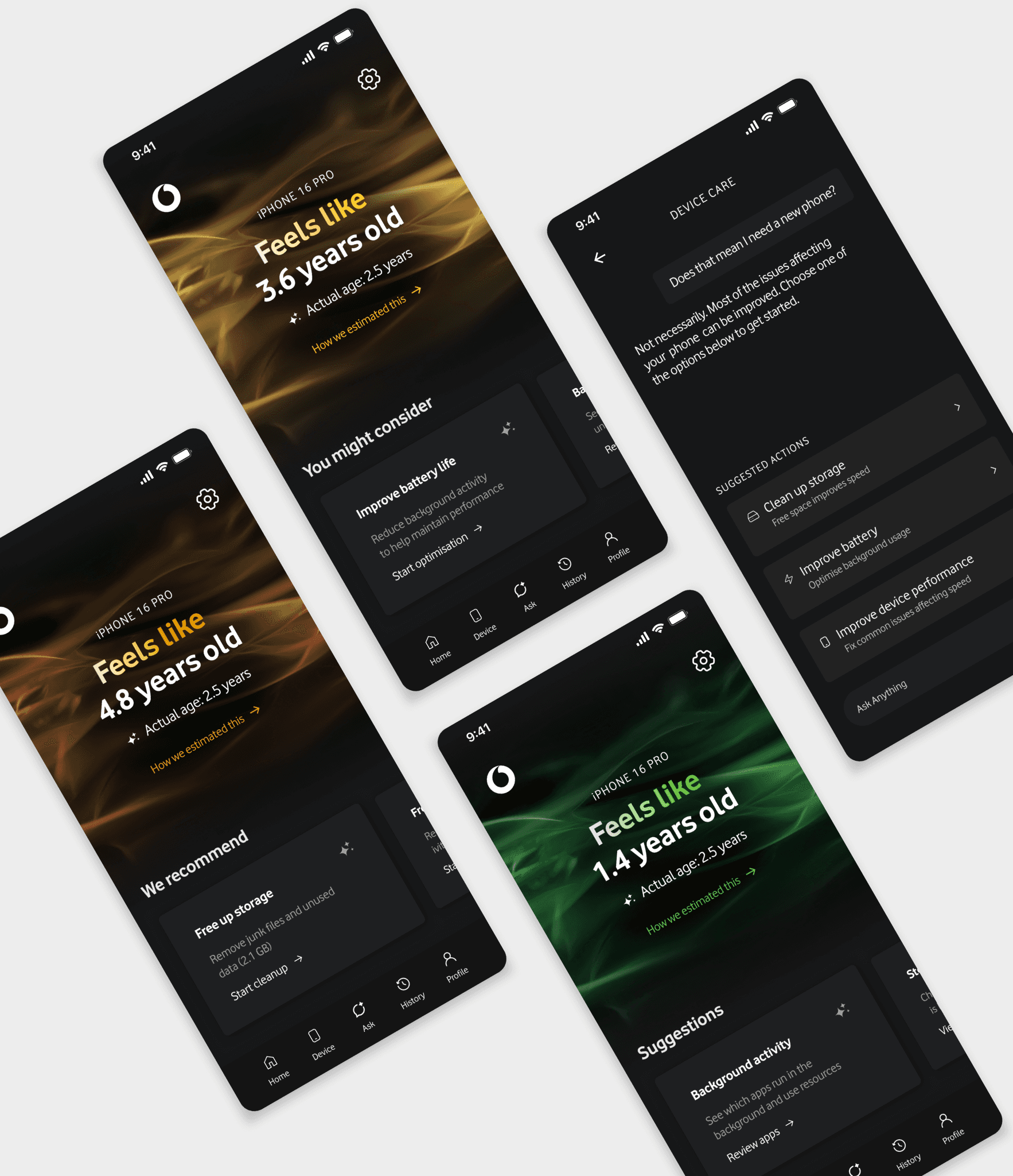 The aim was to help users understand device health before problems occur. Instead of technical diagnostics, the home screen presents a simple “feels like age” indicator, showing how the device is performing in real terms. For example, a phone might feel like it is 4.8 years old despite being only 2.5 years old.