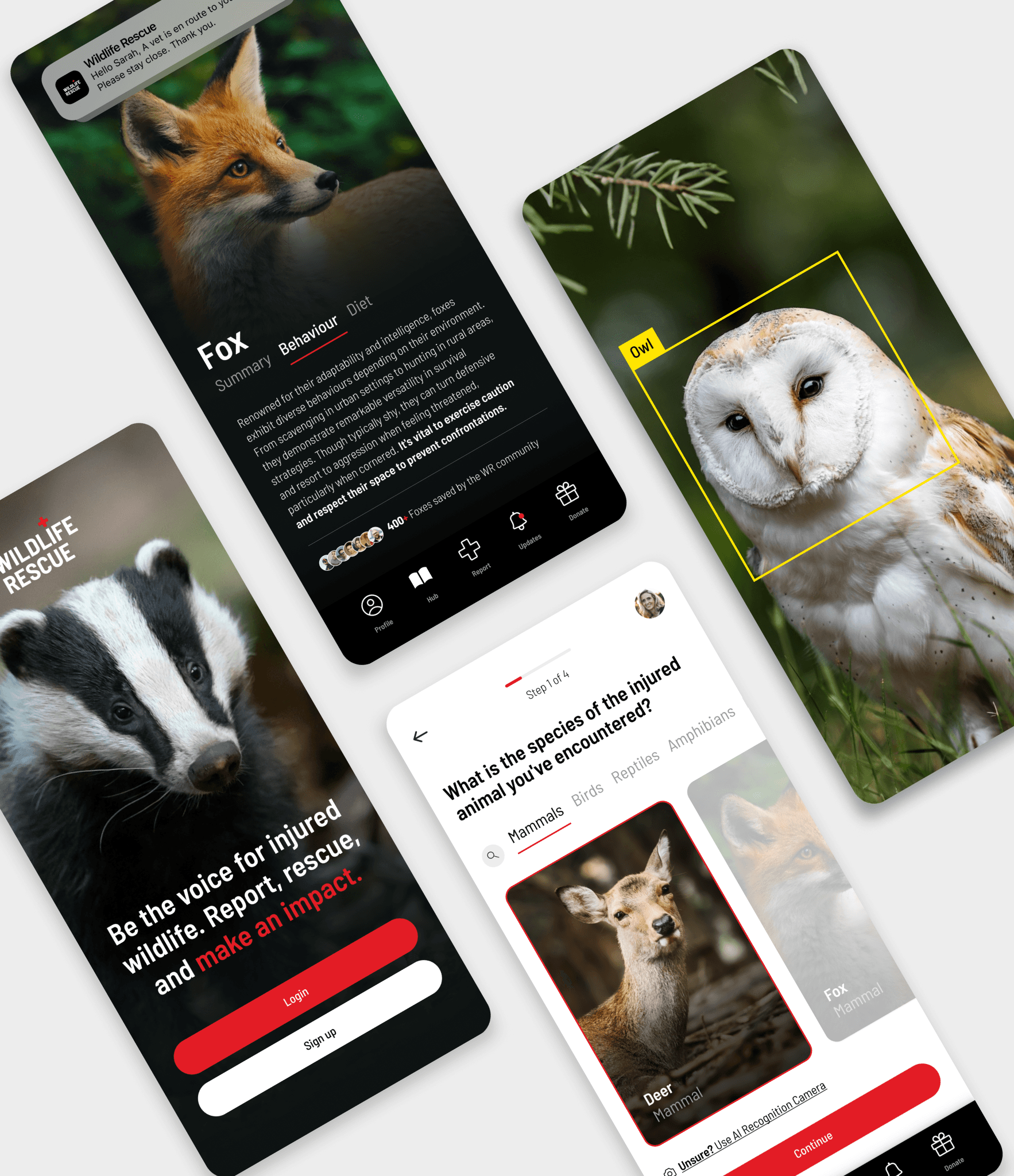 A calm, guided mobile experience that enables fast reporting, clear decision-making and safe interaction with injured wildlife.